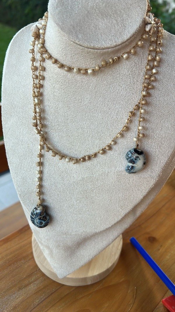 Collar tejido al crochet con mostacillas beige y un caracol de ceramica en azul en casa punta.