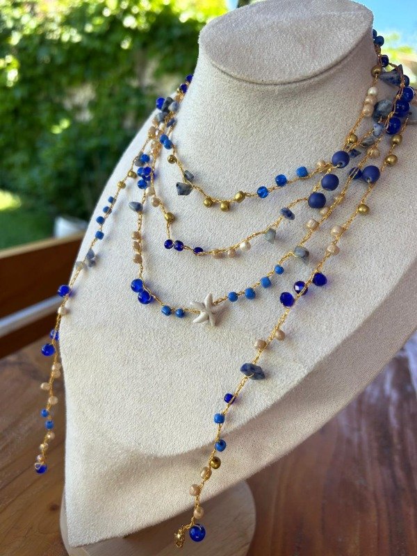 Collar tejido al crochet con piedras naturales, cristales de roca y demás materiales.