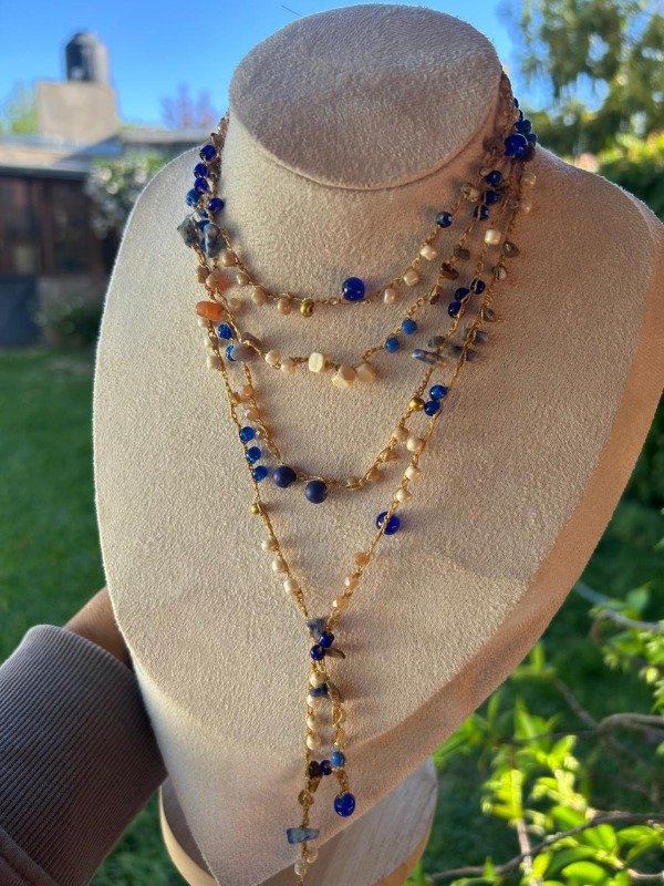 Collar tejido al crochet con piedras naturales, cristales de roca y demás materiales.