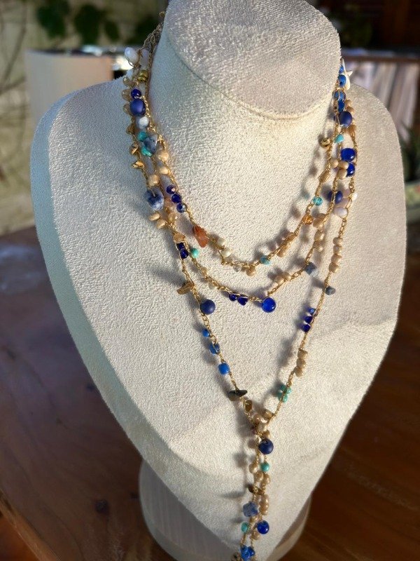 Collar tejido al crochet con piedras naturales, cristales de roca y demás materiales.