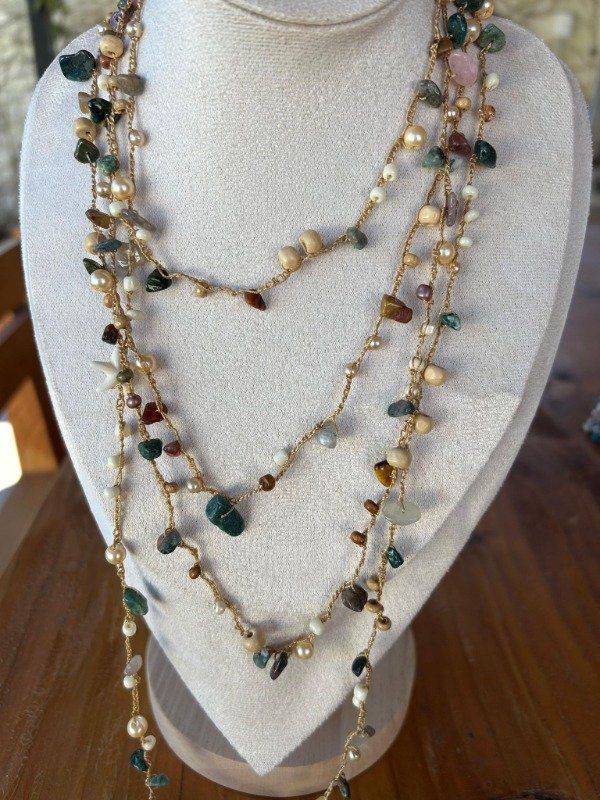 Collar tejido al crochet con piedras naturales, cristales de roca y demás materiales.