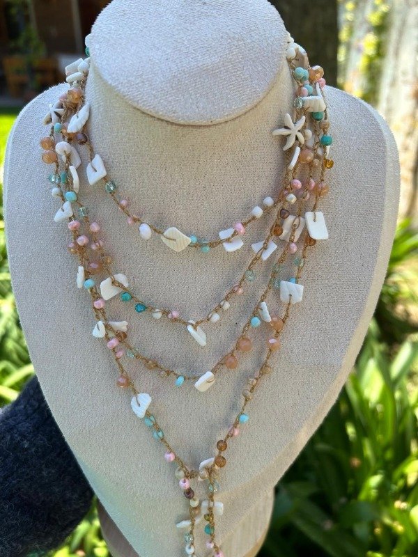 Collar tejido al crochet con piedras naturales, cristales de roca y demás materiales.