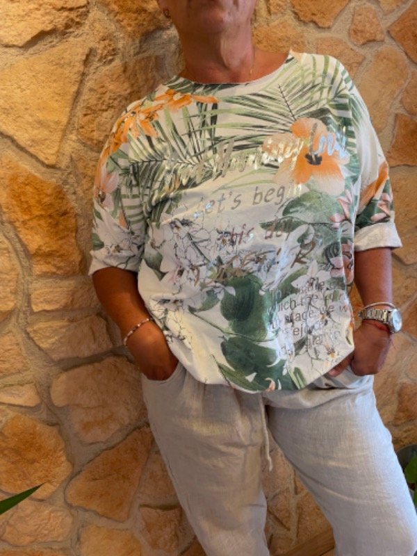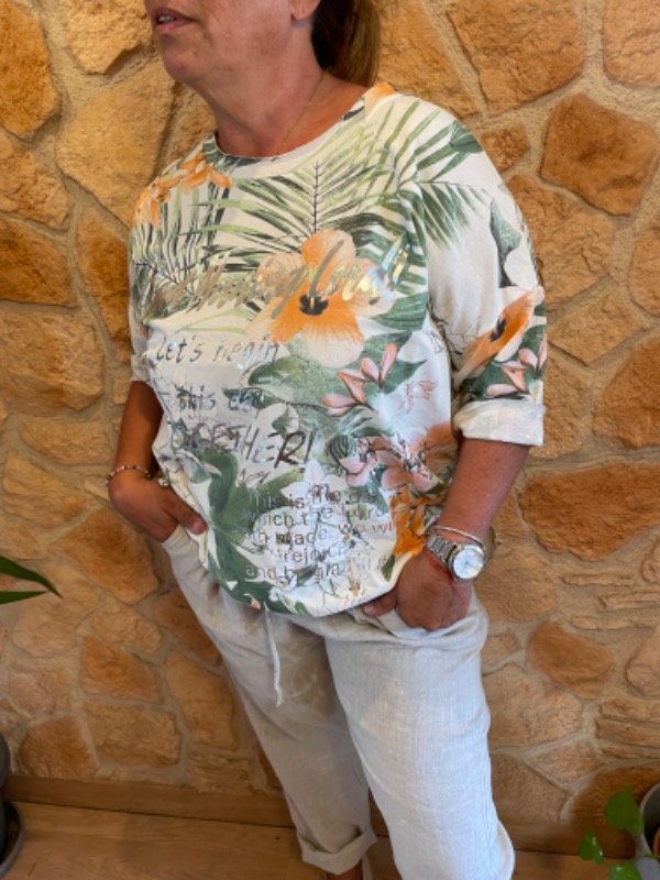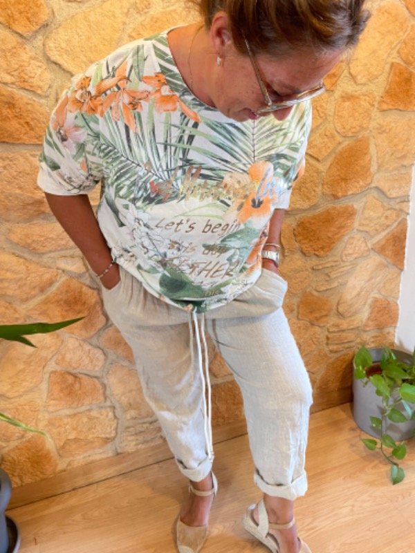 Remera de algodón con estampado dorado y cordón para ajustar a la altura de la cintura
