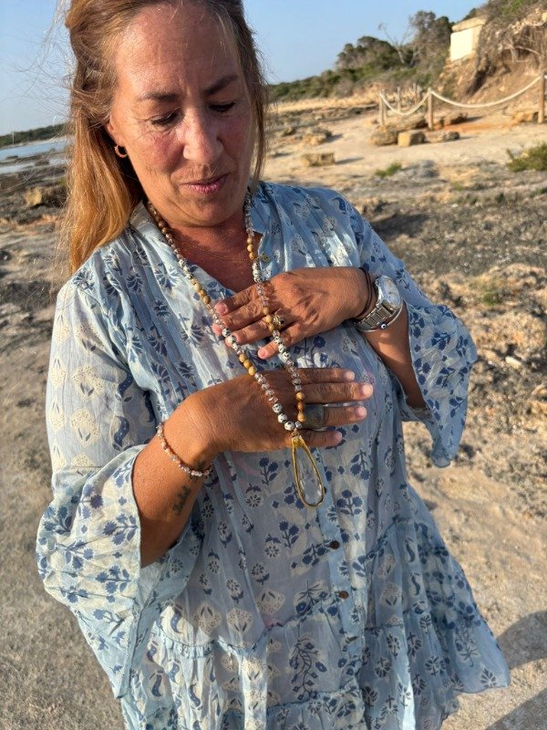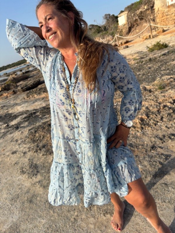 Vestido corto de algodón. Cuello mao bordado y mangas 3/4.